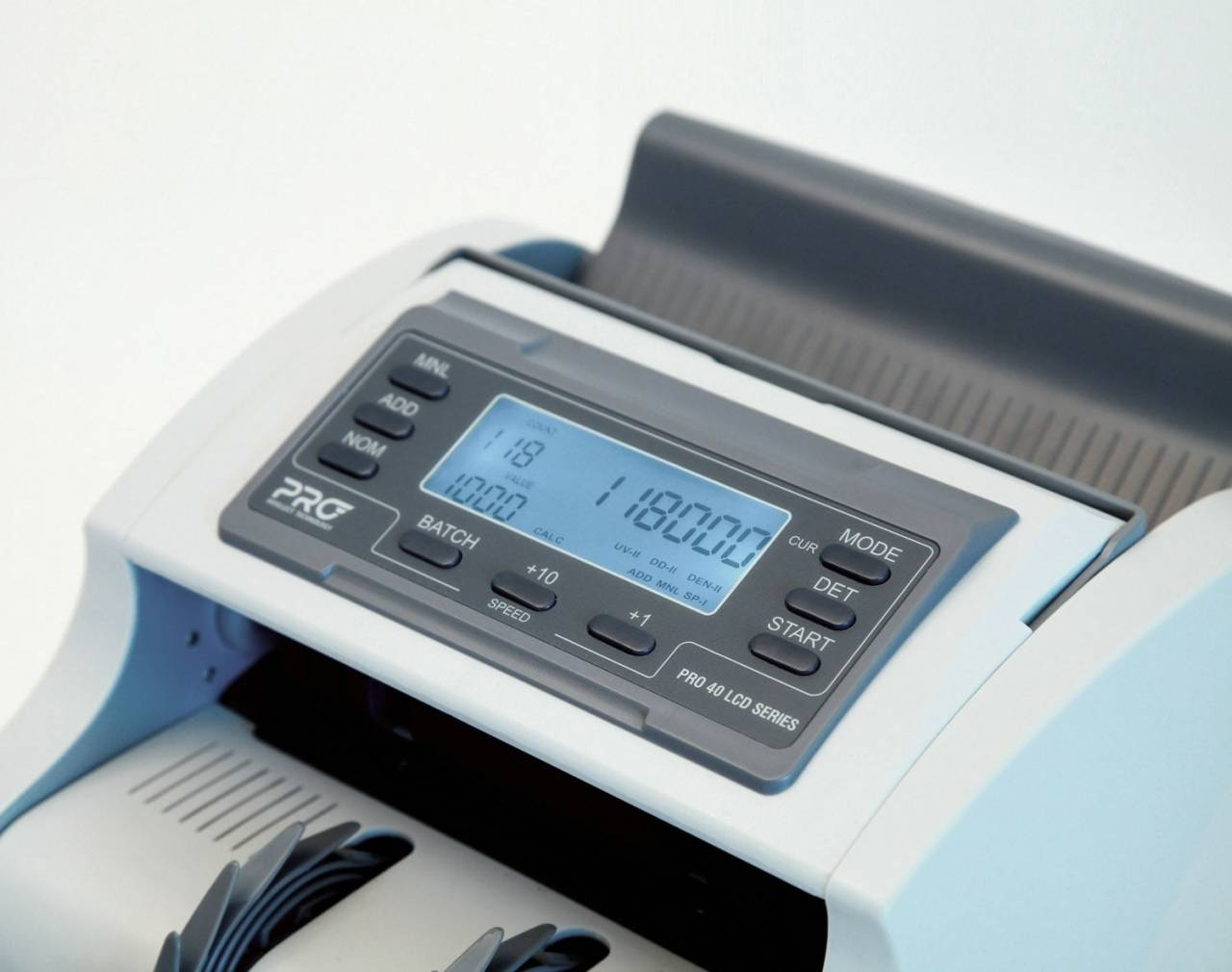 В ходе пересчета счетчик издает мягкий, тихий, приятный для слуха шелест. Благодаря особому строению тракта счетчики банкнот серии PRO 40 являются самыми тихими.