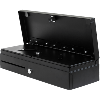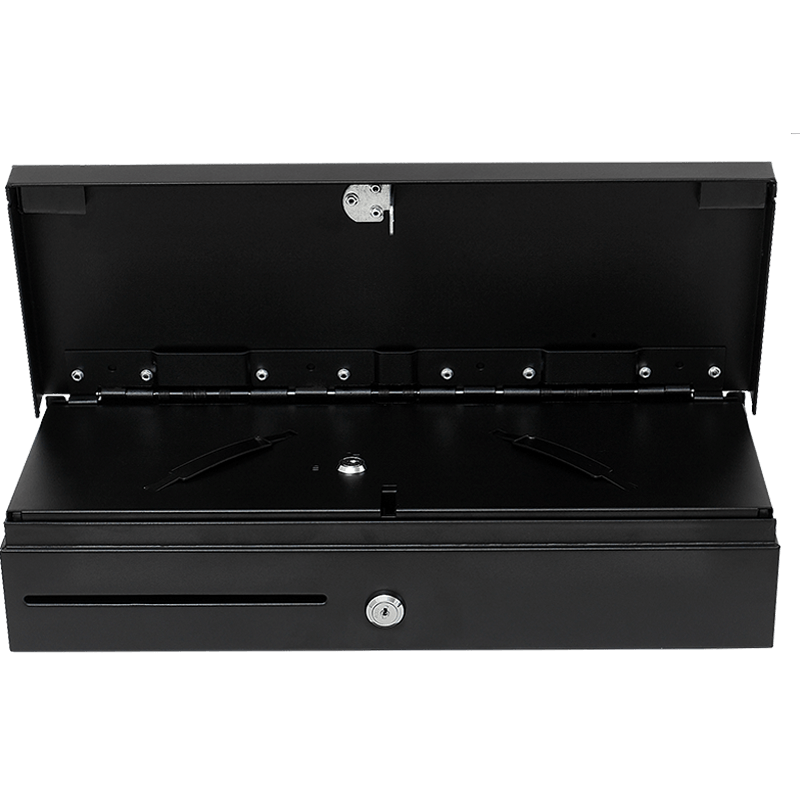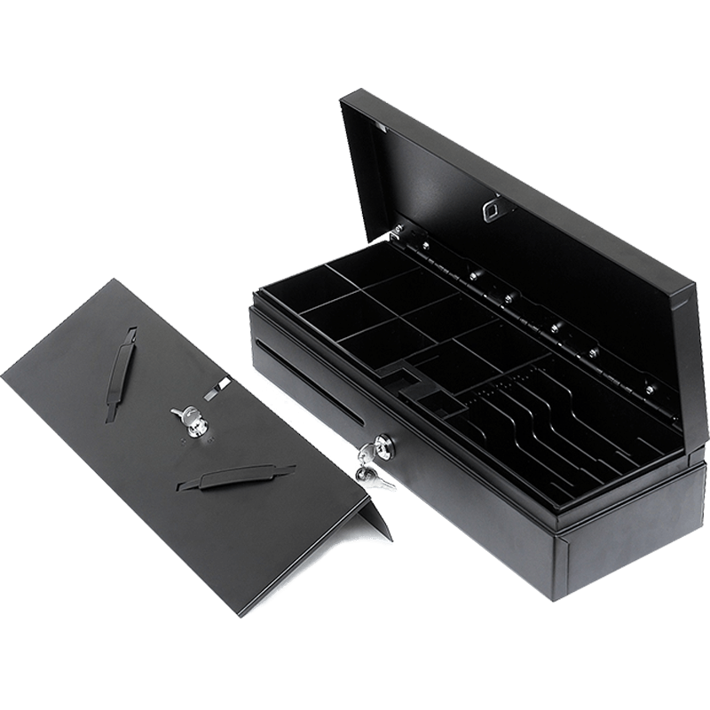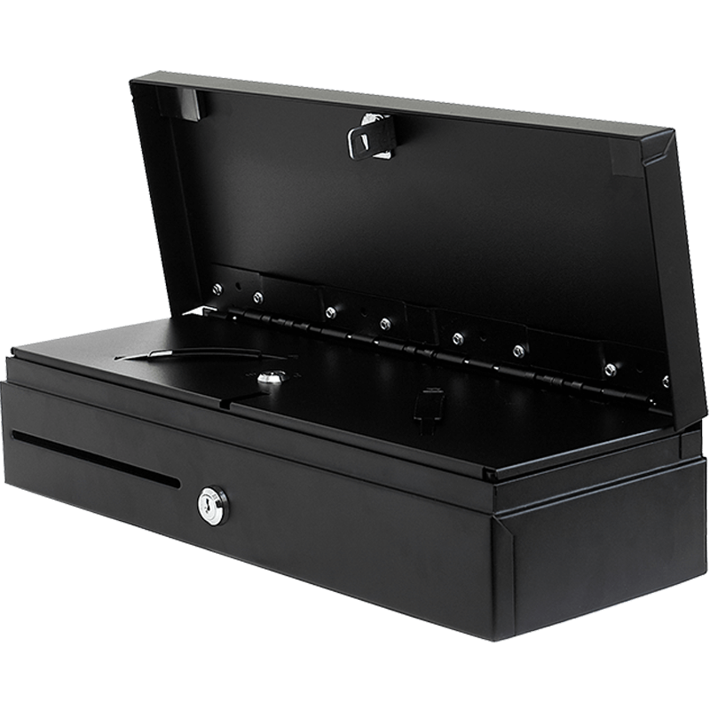 Вместительный внутренний лоток с собственной крышкой содержит шесть вертикальных ячеек для купюр и восемь отделений для монет с покатым краем, а также дополнительный слот для чеков и сертификатов. Наличие отдельной крышки внутреннего лотка позволяет обеспечивать работу сменных кассиров.
