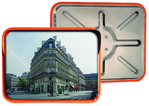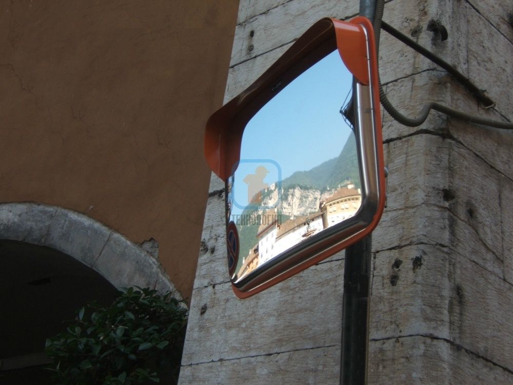 Сферическое зеркало. В верхней части предусмотрен козырек для защиты от солнца и осадков. Выполнено из нержавеющей стали. С задней стороны предусмотрен кронштейн для крепления зеркала к трубе. Кронштейн позволяет отрегулировать наклон зеркала в вертикальной и горизонтальной плоскостях.